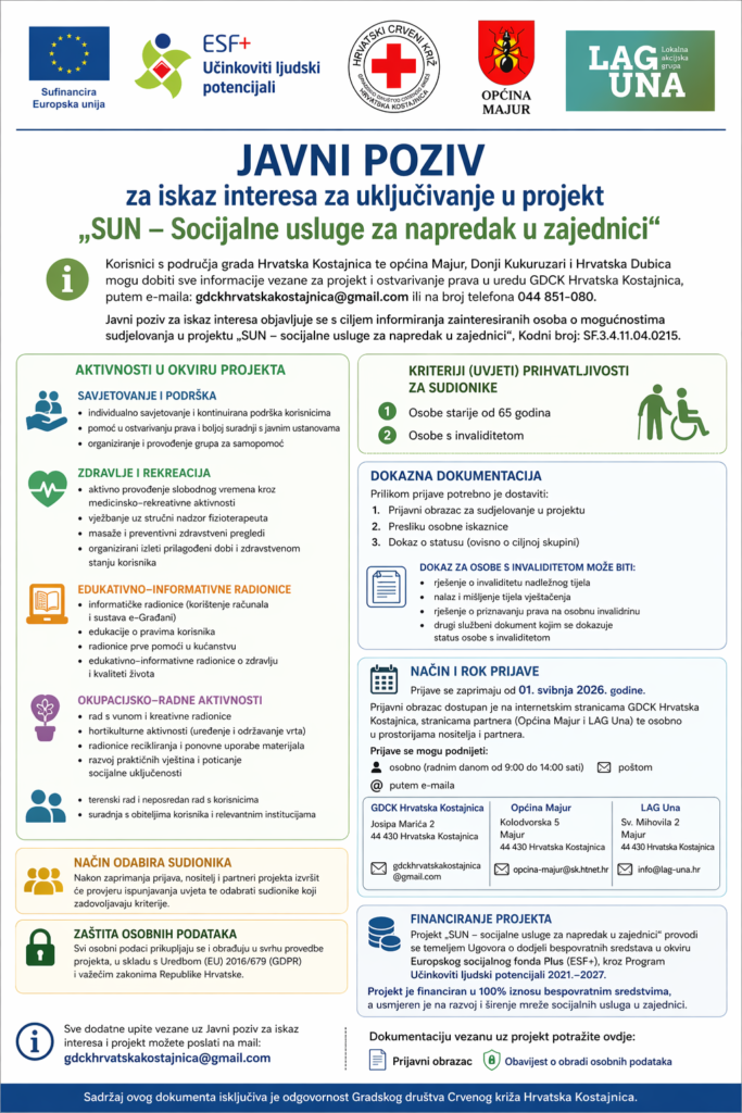 Pozivaju se odrasle osobe s invaliditetom, starije osobe i članovi obitelji/udomiteljskih obitelji ciljnih skupina s područja grada Hrvatska Kostajnica te općina Majur, Donji Kukuruzari i Hrvatska Dubica da se uključe u aktivnosti projekta „SUN – Socijalne usluge za napredak u zajednici“.
